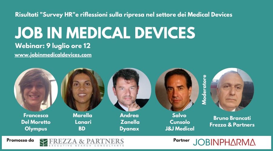Il webinar promosso da Frezza & Partners, e in partnership con Job In Pharma e Gds Communication ha l'obiettivo di approfondire i temi legati alla ripresa dall'emergenza sanitaria, COVID-19, con l'aiuto di importanti manager di settore e con la presentazione della prima ricerca annuale "HR survey in Medical Devices".